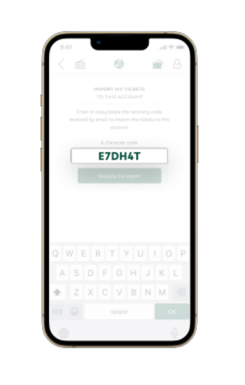 Ouvrez l’app → Mes billets → Ajouter / Récupérer. Saisissez le code reçu par e-mail pour importer vos billets (si vous en avez plusieurs, ils seront côte à côte).